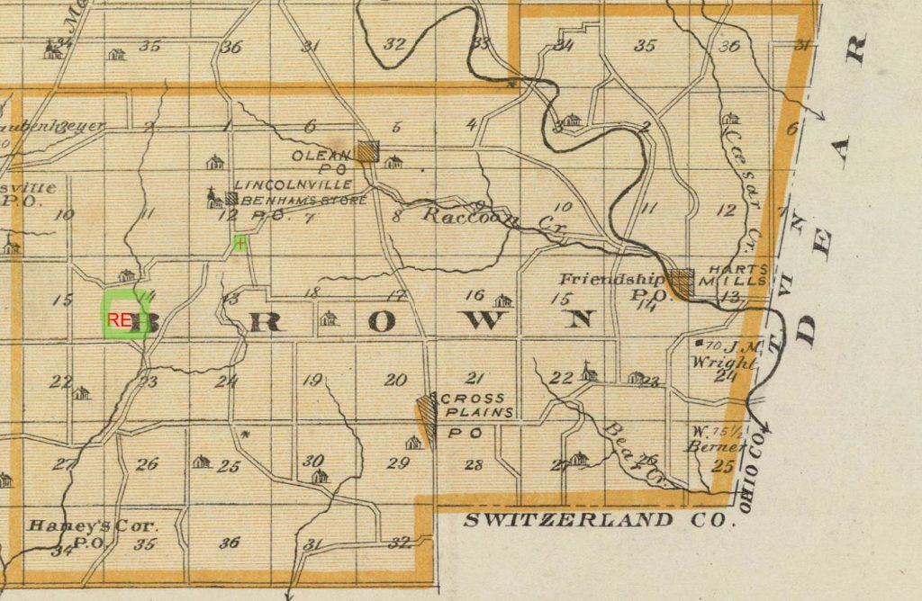 Brown Township in Ripley County, Indiana. Highlighted RE area shows Roger Ellis’ property. The location of the church and cemetery is also highlighted. Source: David Rumsey Map Collection.