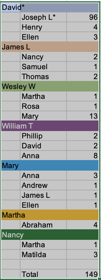 The table shows the number of DNA matches I have identified to date that appear to be descendants of Roger and Susannah. The chart shows matches to seven children. Two daughters, Susannah and Rebecca, married later in life and never had children. I have not found DNA matches to John, who I believe is a son, but whom I have not easily traced. Additional questions about others related to the family remain.
