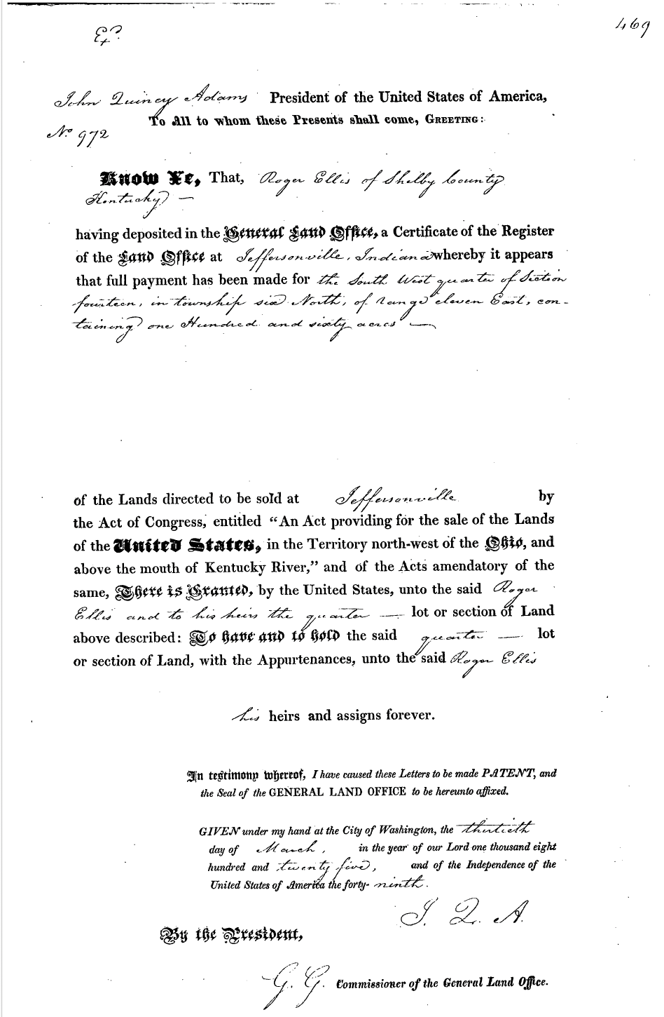 Roger Ellis Land Patent. Source: Bureau of Land Management – General Land Office Records.