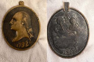 This artifact was missing for many years. Dad said that we had a George Washington, but he had no idea what had happened to it. I always assumed that it was a bust like Will Rogers. After Dad passed, we found it hiding in a cabinet. We initially thought that this piece was a plaque or perhaps a piece that had not come out correctly. However, we have since decided that it is likely an ashtray with George’s face on the outside (bottom) and the political image of the elephant, donkey, and the United States on the inside.