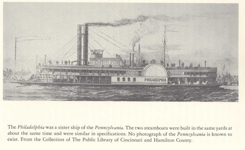 The Pennsylvania was 247 feet long and 32 feet wide.  She had fine furniture and was a “magnificent specimen” being “one of the largest, handsomest, and best officered, and in every way most desirable boats to travel on.”  She, with Captain John Klinefelter as master, was known “for speed, good living, [and] punctuality.”