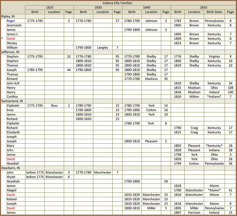 • According to family trees, John was from Maine and died in Dearborn County in 1842; however, I did not readily find him in the 1840 census.  His name was David and had a son David.  Abigail listed above was his wife.  This all seems reasonable and has some documentation.  So, I am declaring this John to be part of the Maine Ellis family.