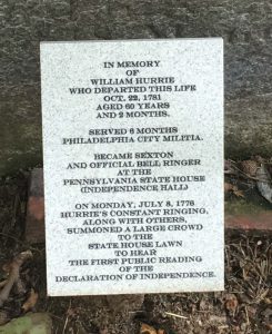 This find was of great historical significance since William Hurrie is believed to have been the person who rang the Liberty Bell to call people to the State House to hear the reading of the Declaration of Independence after it had been signed. The determination that he was the ringer of the Liberty Bell is told in family tradition as well as by the park rangers when visiting the Liberty Bell and other historical locations.