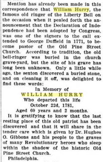 Records indicate that Andrew McNair was absent at least one day during that period and the conclusion by historian is that he was absent on that very historic day. The argument for William Hurry as the bell ringer comes from the records at Old Pine St. Church. William Hurry attended this church and was an early sexton for the church. He was referred to as the old bell ringer and the story of him ringing the Liberty Bell for the reading of the Declaration of Independence was told.