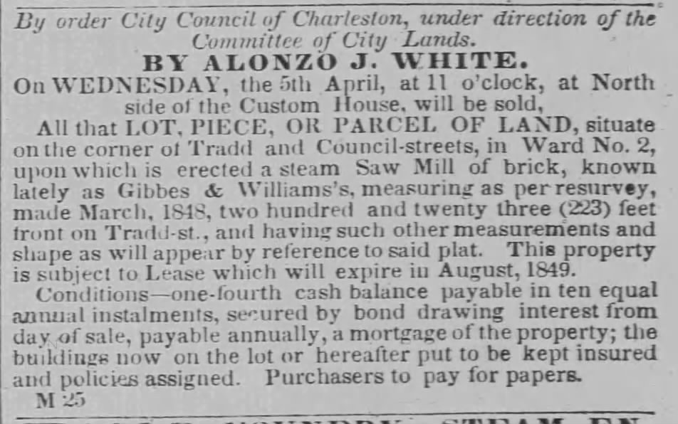 In 1849, Samuel agreed to purchase Gibbes & William’s Mill from the city. However, soon after, he filed a request to be released from the agreement. He offered $100 in exchange for the release. He stated that unexpected difficulty had arisen and he would not be able to meet the requirements of the deal with the city. The city decided that the mill, which they described as at the west end of Tradd Street, should be sold as soon as possible.