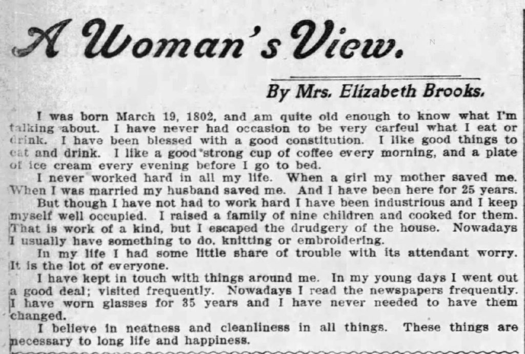 Elizabeth’s keys to a long life seem to be not working too hard, having a strong constitution, and avoiding too much worry. She said that she never had to watch what she ate or drank. And, she always stopped working when she was tired. Read about it in her own words in the adjacent newspaper image. This was printed August 11, 1901, less than a month before she died. Notice: At 99 she got her own byline.