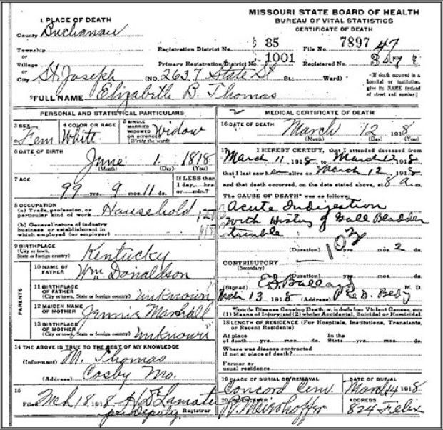Thomas_MainOverviewNewspapersDeath_CertificateMason_County, KYCJ_John_Marshall_FamilyNext_Steps ←Read Previous Read Next→ John Marshall Mystery Death Certificate The following is the death certificate for Elizabeth Brown (Donaldson) Thomas. ←Read Previous Read Next→