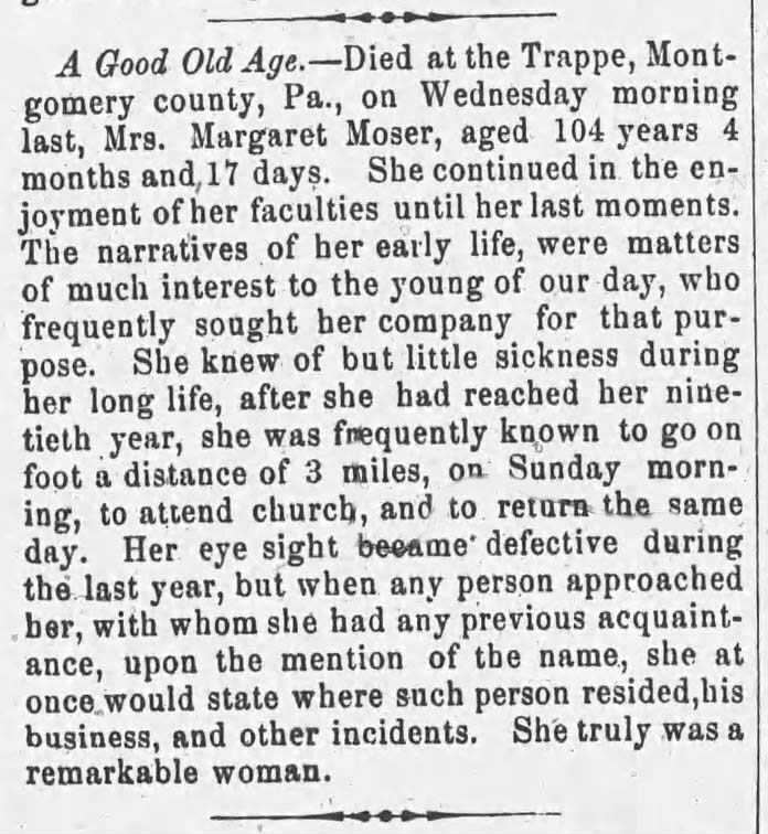 Margaret lived in Trappe, Montgomery, Pennsylvania and attended the Augustus Lutheran Church. The Old Trappe Church, A Memorial of the Sesqui-Centennial Services of Augustus Evangelical Lutheran Church, Montgomery County, Pennsylvania, which was published in 1893 documented her claim.  In 1917, the claim was also included in Old Roads Out of Philadelphia by John Thomson Faris.