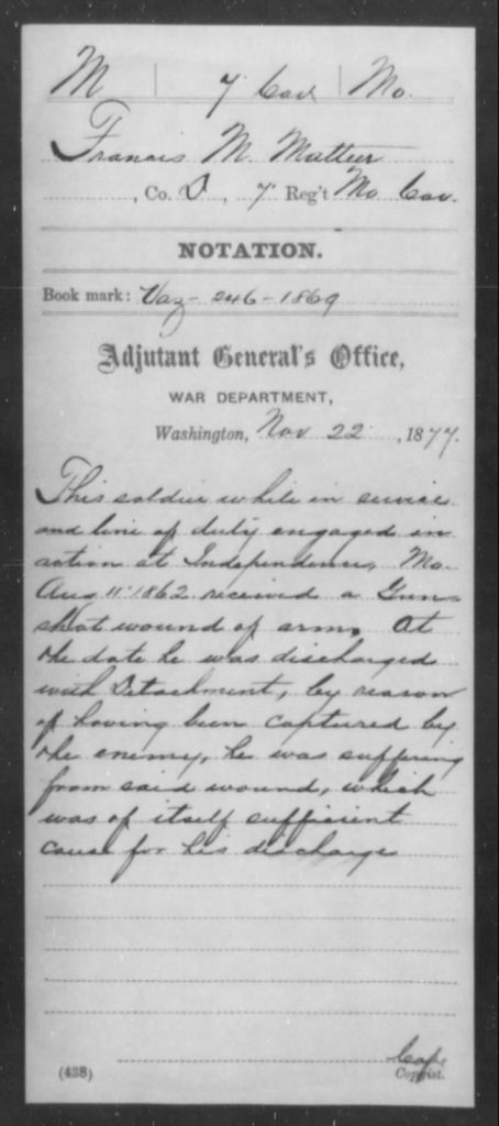 I do not know if Francis’ death on September 16, 1874 was related to his injury at Independence or not. The location of Francis and William’s burials is unknown.