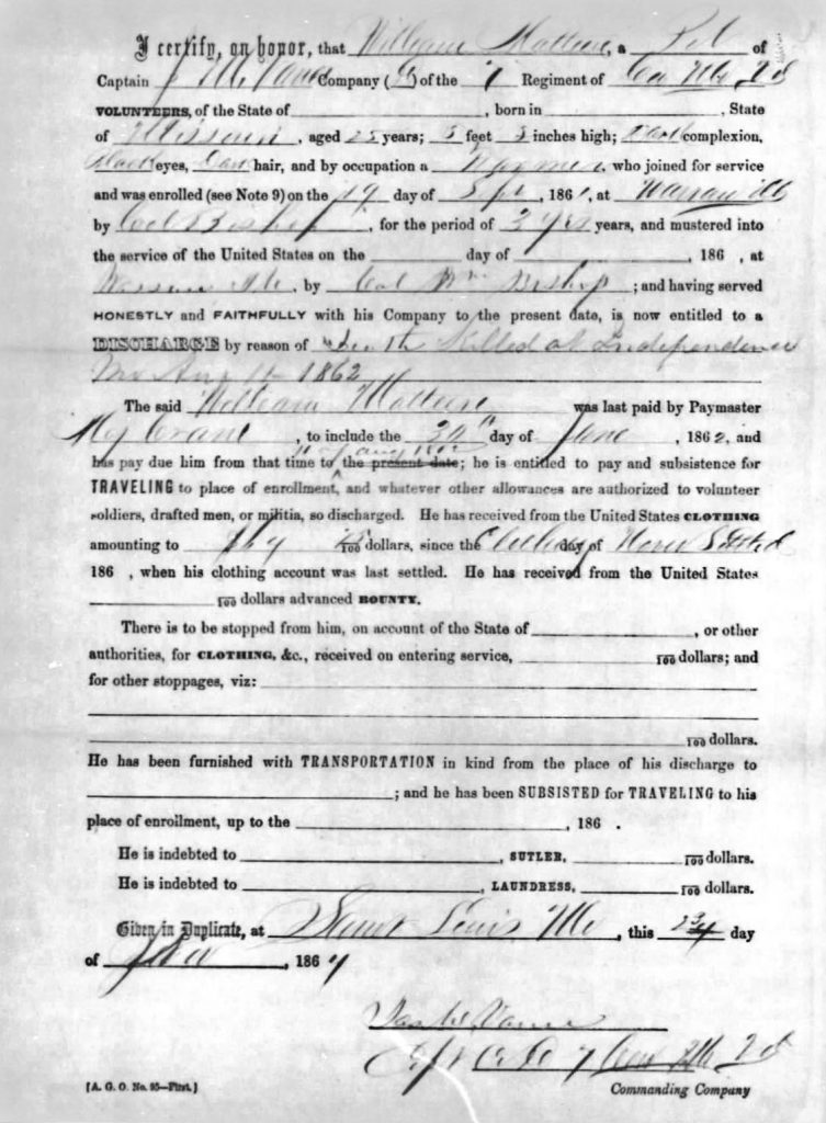 Suffering from his wound, Francis was discharged at St. Louis, Missouri on September 30, 1862 per special order 88 dated August 25, 1862. On June 17 of the following year, Francis filed for a pension with the government over his disability.