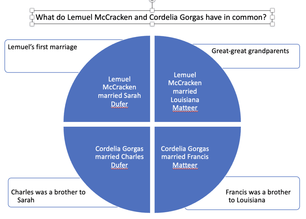 In 1864, Francis married Cordelia (Gorgas) Dufer. Cordelia’s first husband Charles F. Dufer had also been in the Civil War, having served with the 15th Regiment. He had been wounded in the shoulder at Shiloh, Tennessee on April 6, 1862. He was discharged a few days later due to his injury. However, he appears to have died within a matter of months. Interestingly, Charles Dufer was a brother to Sarah Dufer, who was Lemuel McCracken’s first wife.
