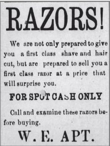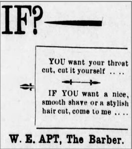 He started barbering sometime prior to 1888 when he opened his own shop on Main Street. Business must have been slow nine years later when he reduced the price for a shave to 5 cents with a special of 22 for a dollar.