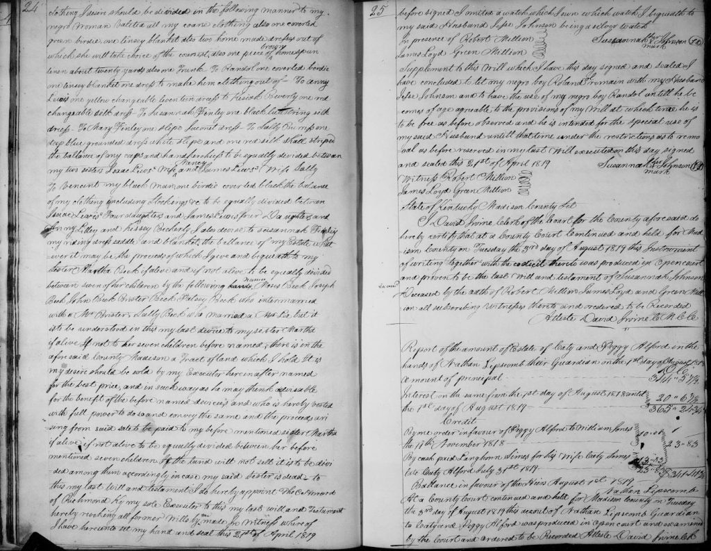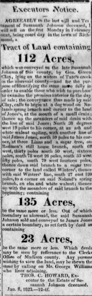 Susannah stated her desire for the land she personally owned in Madison County to be sold with the proceeds to be given to her sister Martha. If Martha was not living, the money was to be split evenly between seven of Martha’s children: Moses Beck, Joseph Beck, John Beck, Brister Beck, Patsey (Beck) Brister, Sally (Beck) Lee.