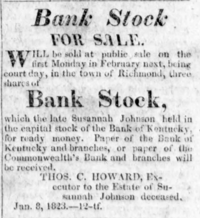 Susannah had shares of stock in the Bank of Kentucky. When issued, these shares had a value of $100 each. She gave four shares of stock to her husband, and three shares to her brother Isaac. She gave her niece Susannah (Lewis) Finley six shares and her niece Susannah (Lewis) Ellis, my 4th great grandmother, three shares.