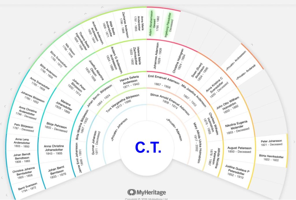 The diagram below shows C.T.’s family tree from MyHeritage. Her Name has been replaced with initials for privacy.