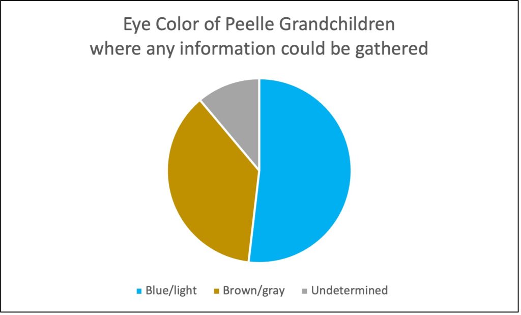 With the exception of one of Passco and Martha’s children, all of them appeared to have had children with a range of hair color from light to dark.  In that particular family, none of the kids had light hair or blue eyes.  The remaining families had either a mix of blue and brown eyes or exclusively blue eyes.