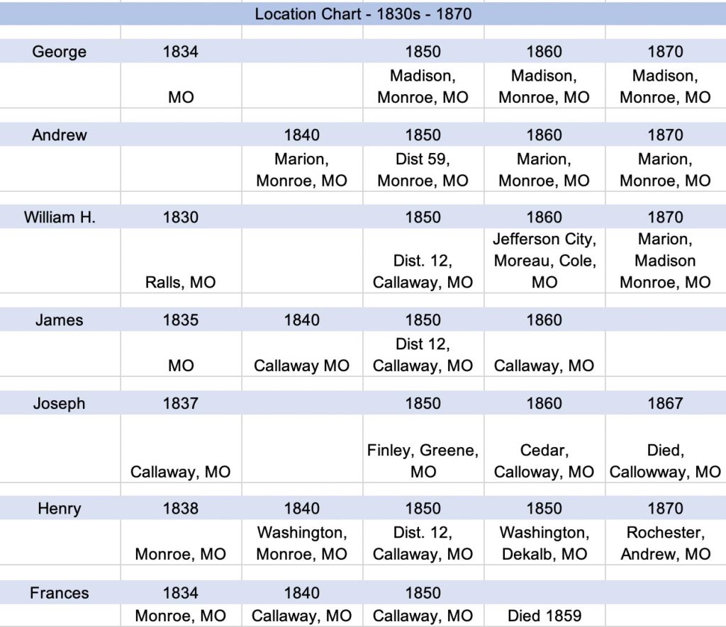 Records for potential family members begin showing up in a cluster of counties in eastern Missouri in the 1830s. The chart shows where each of the families are found up through 1870. The question remains, “Are they the right Thomases?”