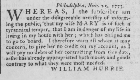 A newspaper from the 1700’s mentions that William Hurrie would not be responsible for the debts of his wife. At first I did not realize the social and legal consequences of such a statement. It didn’t simply mean that he thought she was spending irresponsibly or that she had separate finances. Stating publicly that he would not be financially responsible constituted what is called self-divorce. He was basically stating that their marriage was over. No paper work needed to be filed as it had been openly stated.