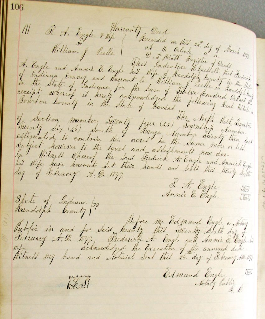On February 25, William J. husked more corn before leaving for Winchester that evening. The next day William J. did the paperwork necessary to purchase a 160-acre property near Hiattville, Bourbon County, Kansas from Frederick A. and Annie E. Engle. William J. signed for the property purchasing it for $1200 plus taxes owed. The sale took place in Randolph County because despite owning property in Kansas, the Engle family lived in Randolph County, Indiana. The transaction would not be recorded in Bourbon County for another month.