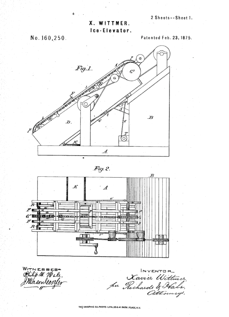 Xavier invented enhancements to ice elevators. His ice elevator used one continuous chain instead of two and could have a variable number of hooks as needed. He made four specific claims of invention in his patent granted December 23, 1875.